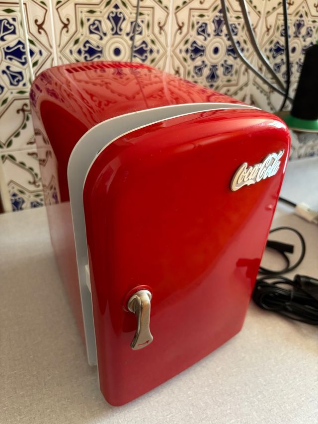Pequeña nevera de color rojo con el icónico logo de Coca-Cola. Ideal para mantener bebidas frías. - Diseño retro. - Asa plateada.