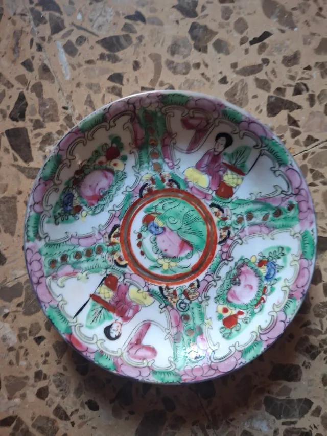 Este es un mini plato decorativo con un diseño tradicional japonés. Presenta una escena detallada con figuras y motivos florales.