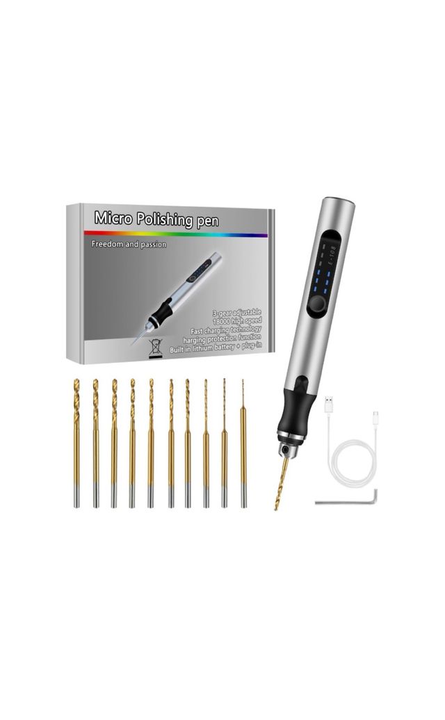 Detalles del productoMini taladro eléctrico Comius con diseño ergonómico y acabado plateado. Incluye varios accesorios para pulir y taladrar.