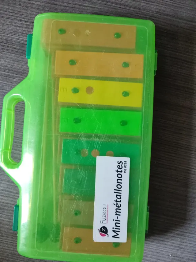 Detalles del productoMini xilófono de metal con 8 notas de colores, ideal para iniciarse en la música. Incluye un estuche de plástico verde para guardarlo y transportarlo fácilmente.
