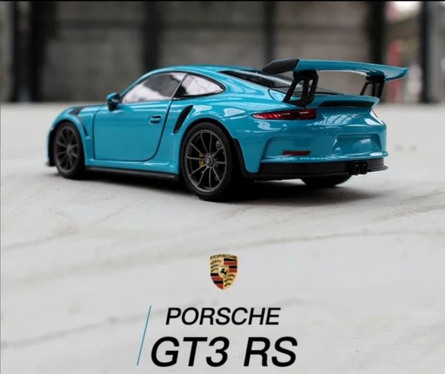 miniatura PORSCHE 911 GT3 RS en COLOR AZUL COBALTO escala 1:24 (20 Cms Longitud) en SU CAJA EXPOSITOR PRECINTADO y ALEACIÓN DE ZINC.
