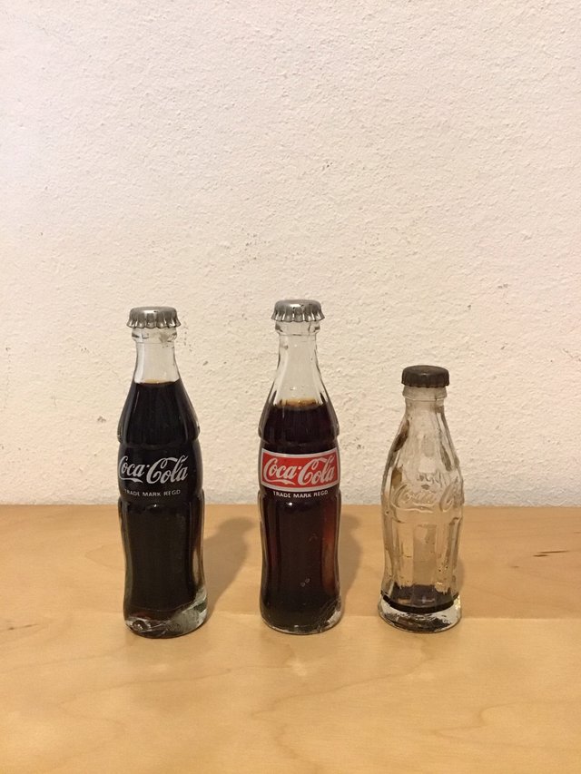 Conjunto de tres miniaturas antiguas de botellas de refresco Coca Cola.