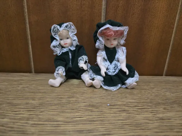 En condiciones aceptablesDetalles del productoConjunto de dos miniaturas de muñecas de porcelana, vestidas con trajes victorianos.