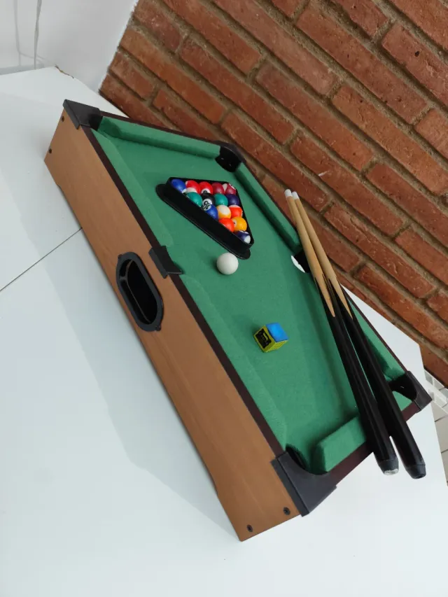 Mini mesa de billar de 51 x 31 x 9 cm Incluye 2 Tacos, 1 Juego de Bolas, 1 Triángulo, 1 Cepillo y 1 Tiza. Ideal para iniciarse en casa al billar