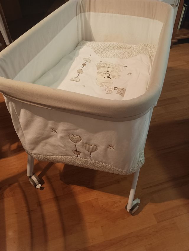 Minicuna con ruedas, colchón y edredón. Forro de tela fácilmente desmontable para lavarlo