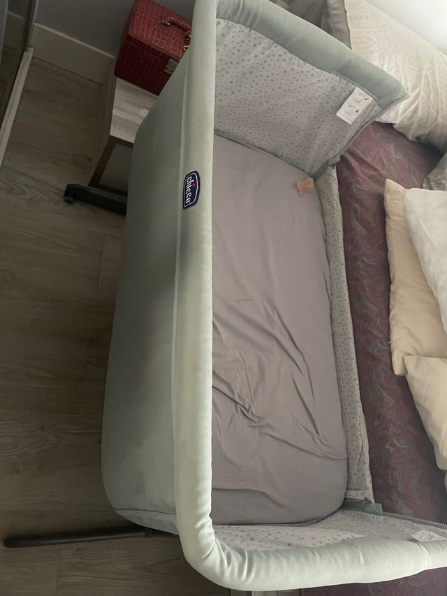 mini cuna chicco verde con sabanas y funda nordica. Se puede poner de colecho o normal y tiene ruedas oara transportarla a todos lados , con funda para transporte.