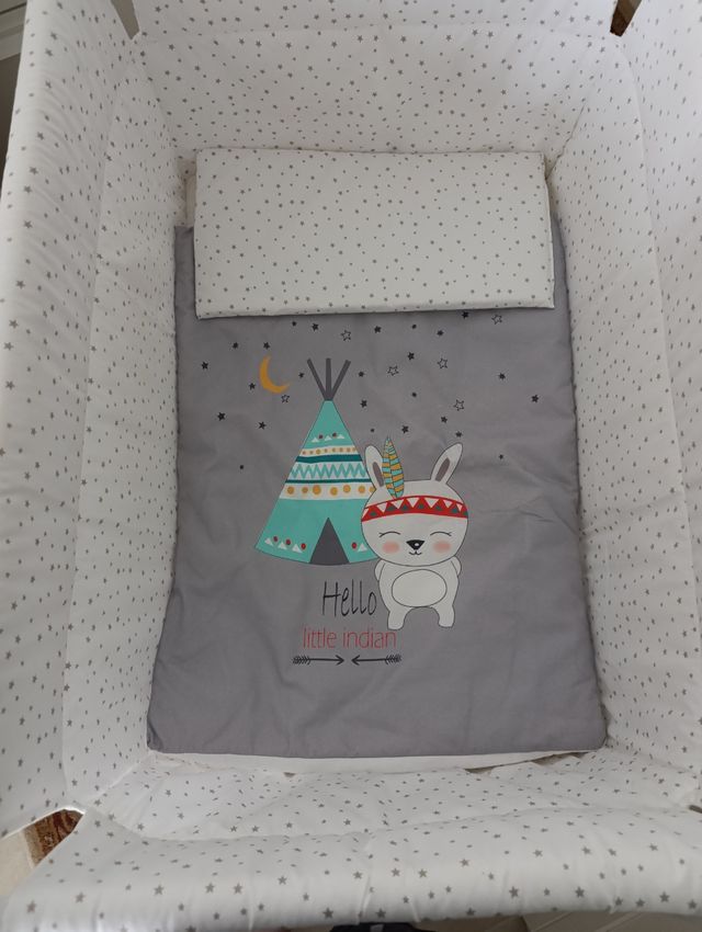 Detalles del productoMinicuna tijeras Interbaby con estructura de madera en haya natural lacada en blanco. Incluye: vestiduras, colchón, colchita y almohada