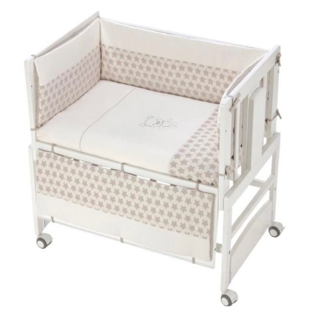 Detalles del productoMinicuna 5 en 1, fabricada en madera maciza lacada en blanco que posee cuatro ruedas con freno y lateral abatible. Tiene seis posiciones de altura. Mueble versátil que, además de minicuna y cuna de colecho, tiene la opción de balancín, sofá, juguetero y escritorio. se vende con colchón, chichonera , relleno nordico y funda con sabanitas a juego