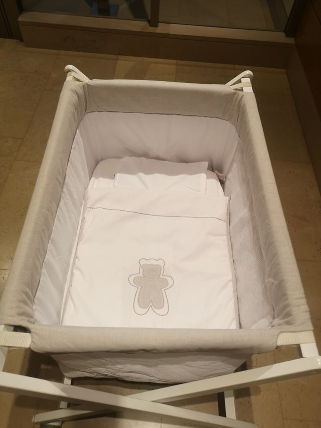 Minicuna en tonos beis y blanco. Incluye, colchón, funda de colchón, bajera y edredón con almohada. Plegable y con ruedas