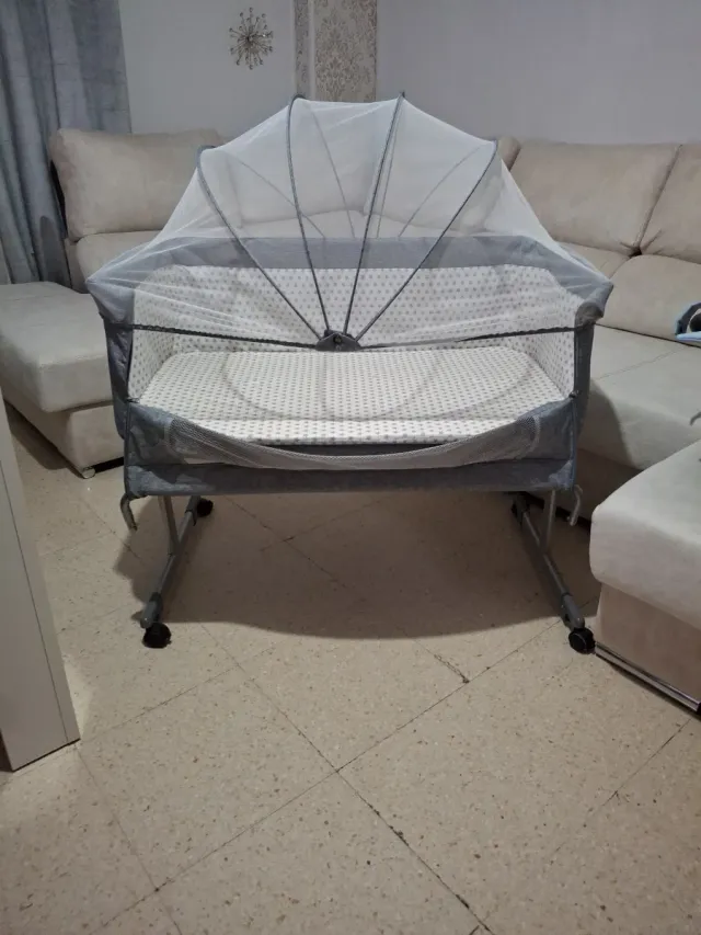 Detalles del productoMinicuna con estructura ajustable y lateral de malla para ventilación.