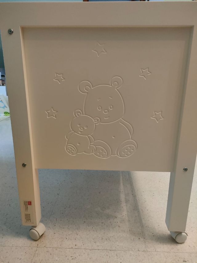 minicuna de madera, con ruedas y panel en la base del colchón #bebé #dormir #cuna #minicuna #niño #niña #sueño #pequeño