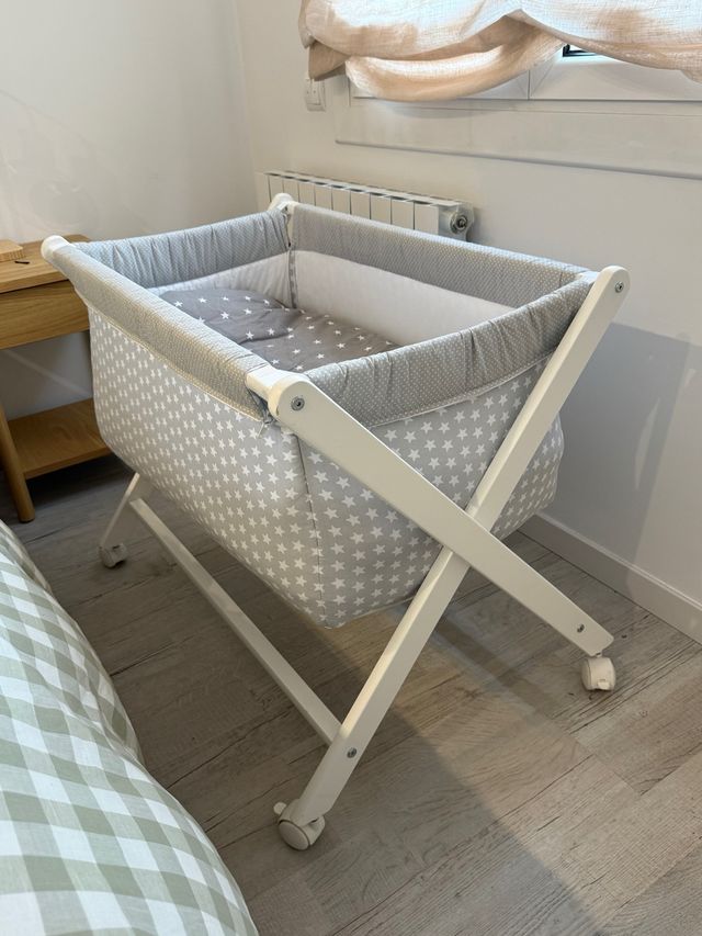 Minicuna bebé madera blanca + textil + colchón