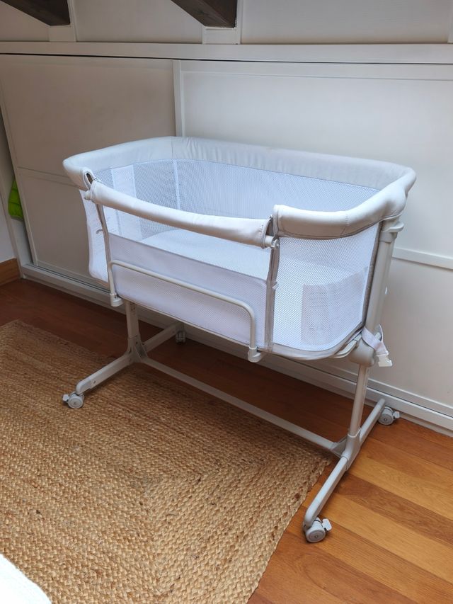 Minicuna de colecho con laterales de malla transpirable. Estructura metálica y ruedas para facilitar su movilidad. - Laterales de malla. - Estructura metálica. - Ruedas.