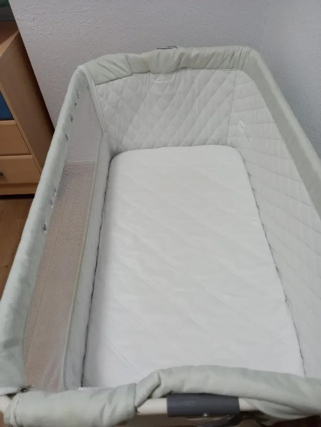Minicuna de colecho con un diseño acolchado y lateral de malla. - Minicuna con colchón incluido. - Laterales de malla para ventilación.