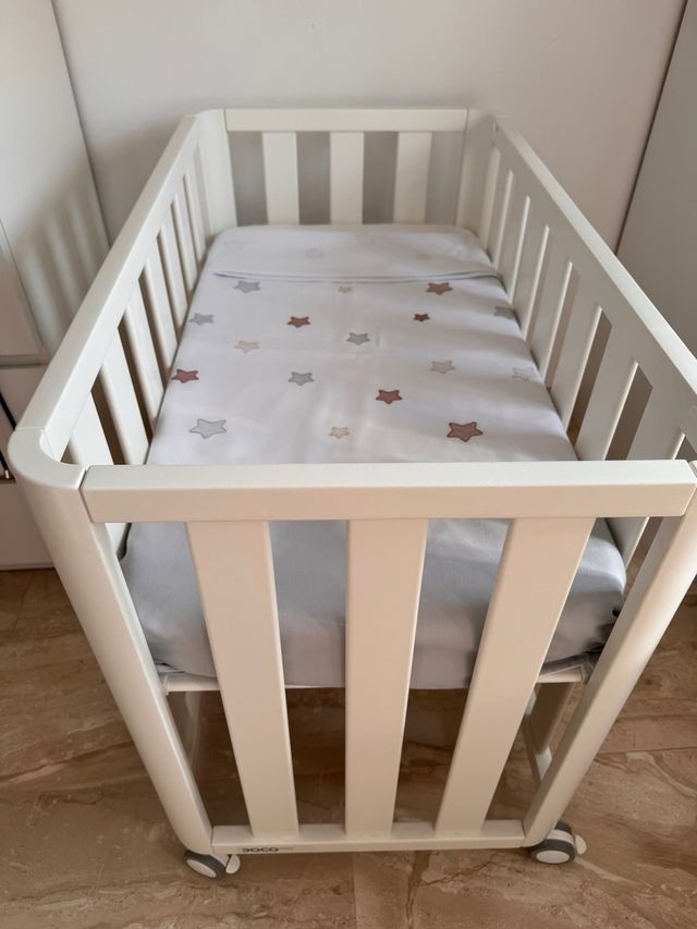 Estructura de madera blanca, resistente y estable, con ruedas para facilitar el movimiento entre habitaciones. Incluye colchón y juego de sábanas con diseño de estrellitas (como se ve en las fotos).
