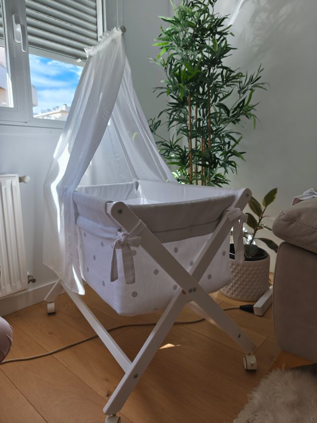 Detalles del productoMinicuna blanca con un bonito dosel de tela.