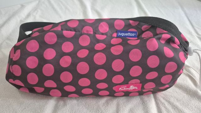 Detalles del productoMinicuna de viaje con un divertido estampado de lunares rosas sobre fondo gris oscuro. Es ligera y fácil de transportar.