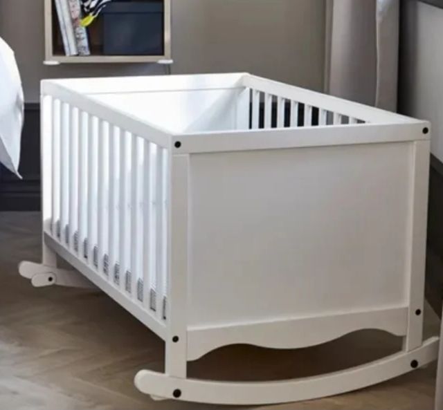 Minicuna modelo Solgul de Ikea con base balancín. - Color blanco. - Estructura de madera. - Laterales de barrotes. Incluye colchón y regalo sabanitas