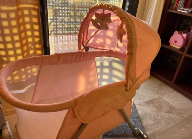 Detalles del productoMinicuna en color rosa, ideal para los primeros meses del bebé. Cuenta con un dosel y un móvil con figuras.