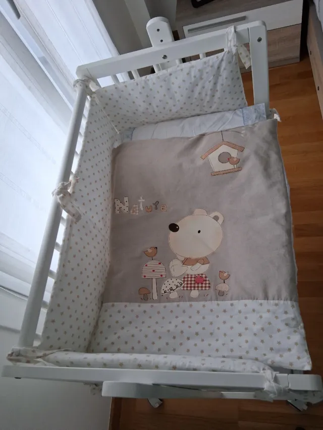 Detalles del productoMinicuna de madera en color blanco, ideal para los primeros meses del bebé. Incluye chichonera, colcha y colchón.