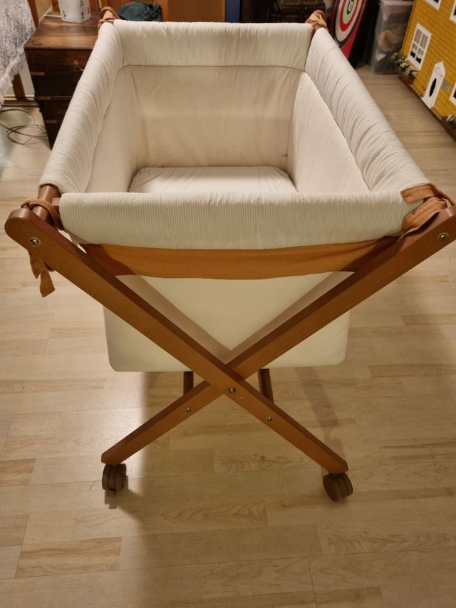 Detalles del productoMinicuna de madera con ruedas para un fácil desplazamiento. Colchón incluido. Medidas del producto