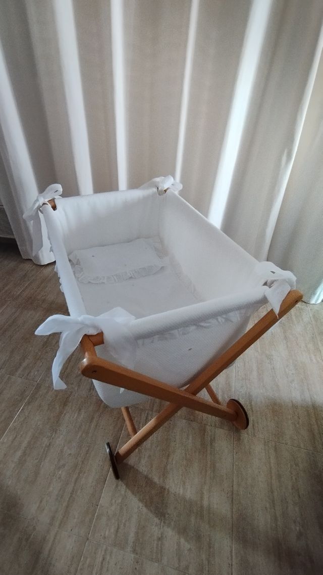 Detalles del productoMinicuna de tela de pique , con unos lunares de colores suaves rosa , azul y amarillo . Lo