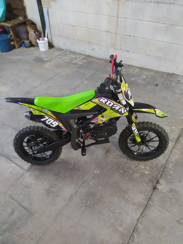 Detalles del productoMinimoto de cross marca Roan, modelo 709, con un llamativo diseño en verde y negro.