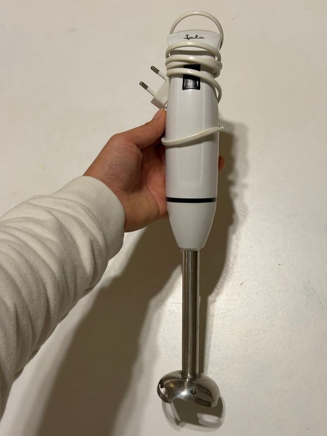 Minipimer de cocina de la marca Jata, en color blanco. - Diseño ergonómico. - Cable enrollable para fácil almacenamiento. - Pie de acero inoxidable.