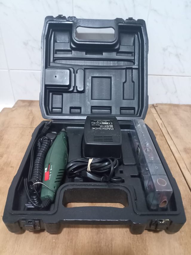Detalles del productoHerramienta tipo Dremel de la marca Parkside. En buen estado estético y de funcionamiento. Tiene velocidad regulable, alimentador externo que facilita el manejo al ser más ligero en mano y accesorios varios. Va en un maletín.