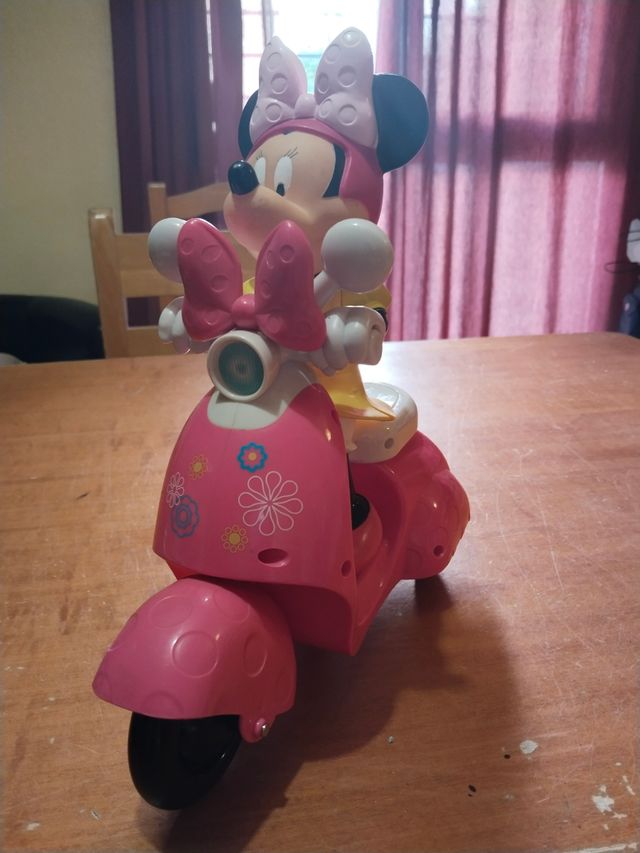 - Minnie Mouse está montada en una moto scooter rosa.