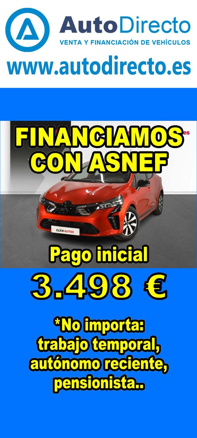 Detalles del producto¿No consigues financiación? ¡Tenemos la solución! *************************************************************************** RENT CREDIT: Aprobamos más del 90% de las operaciones. No importa ASNEF o RAI, impagos pendientes, ser autónomo o empresa reciente, ser pensionista. Imprescindible pago inicial del 20%. Ejemplo de operación: MITSUBISHI COLT 100T 1.0 90CV MOTION. Ref. W959653MZP - Precio vehículo financiado: 17490 €. - Pago inicial de 3498 €. - Cuota mes desde 366 €. - Impuesto de circulación y garantía (mínimo 1 año) incluidos. *************************************************************************** ✅ Más de 3.000 COCHES Y FURGONETAS EN STOCK. ✅ HASTA 2 AÑOS DE GARANTIA. ✅ Kilómetros certificados. ✅ 17 concesionarios repartidos en toda España. ♻️ Aceptamos tu coche como parte del pago. *************************************************************************** IMPORTANTE: -. Este anuncio, no es vinculante, puede contener errores. SE MUESTRAN A TÍTULO INFORMATIVO Y NO CONTRACTUAL. -. Consultar disponibilidad del vehículo y datos exactos: fecha de matriculación, importes, etc,... *************************************************************************** Te ofrecemos distintas opciones: financiación, renting, alquiler con opción a compra, rent credit. En nuestro stock disponible encontraras: 3008 , qashqai , corolla , rav4 , sandero , Duster , yaris , 2008 , Tucson , Ibiza , 208 , Sportage , a3 , c4 , Formentor , q3 , yaris cross , 500 , c3 , arona , zs , x1 , kona , corsa , clase a , león , 308 , serie 1 , golf , focus , captur , a1 , tiguan , i20 , t roc , stonic , xc40 , civic , q5 , serie 3 , glb , 5008 , ateca , clio , kuga , c hr , i30 , arkana , juke , a4 , x3 , cx 5 , xc60 , kamiq , taigo , Mustang , x6 , polo , ceed , karoq , x2 , Astra , niro , cx 30 , a5 , cooper , megane , moka , fiesta , hs , q2 , clase c , serie 3 , renegade , picanto.