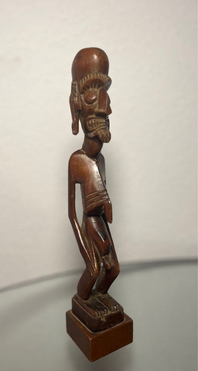 Detalles del productoLa figura de la imagen es una réplica de un Moai Kavakava, una estatua de madera de la Isla de Pascua (Rapa Nui). Representa una figura ancestral con detalles en el rostro y el cuerpo.