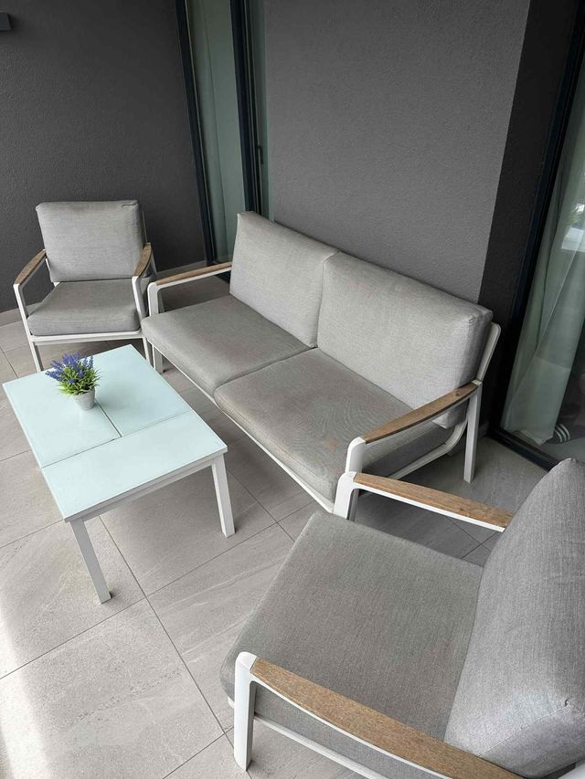 Detalles del productoConjunto de muebles de exterior para terraza o balcón. Incluye un sofá de dos plazas y dos sillones individuales, además de una mesa auxiliar.
