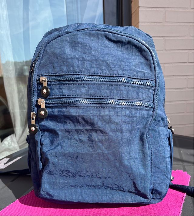 Mochila azul de tela con múltiples bolsillos.