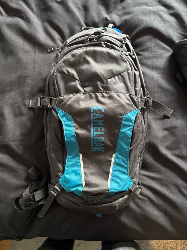 Detalles del productoMochila Camelbak de color gris con detalles en azul turquesa, diseñada para actividades ciclistas.