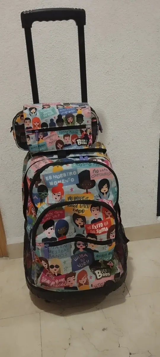 Detalles del productoConjunto de mochila con ruedas y estuche a juego, con un diseño divertido y colorido.