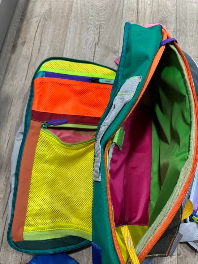 Mochila Cotopaxi con un diseño vibrante y múltiples compartimentos.