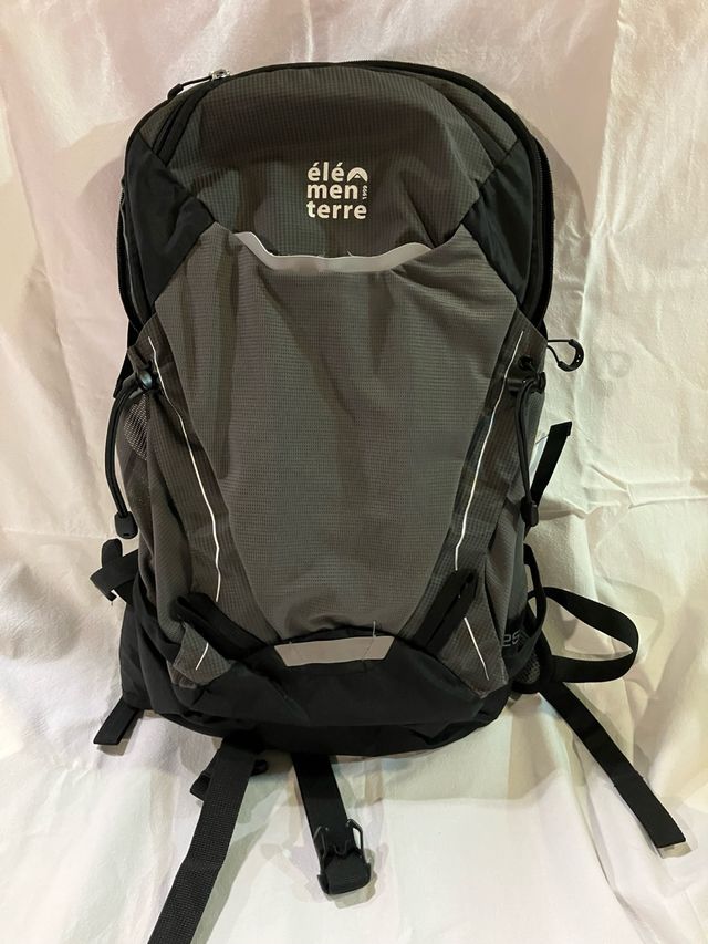 Detalles del productoMochila de senderismo o uso diario de la marca Elementerre con una capacidad de 25 litros. Diseño moderno en tonos grises y negros.