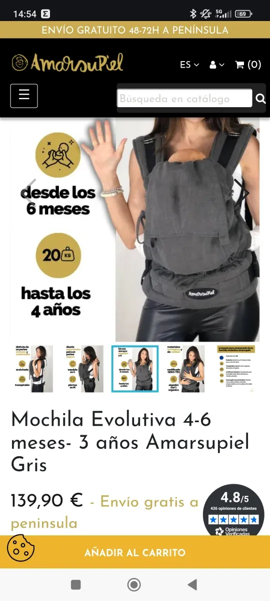 Detalles del productoMochila evolutiva Amarsupiel en color gris, apta desde los 4 meses hasta los 4 años. Vale 139€ en su web.