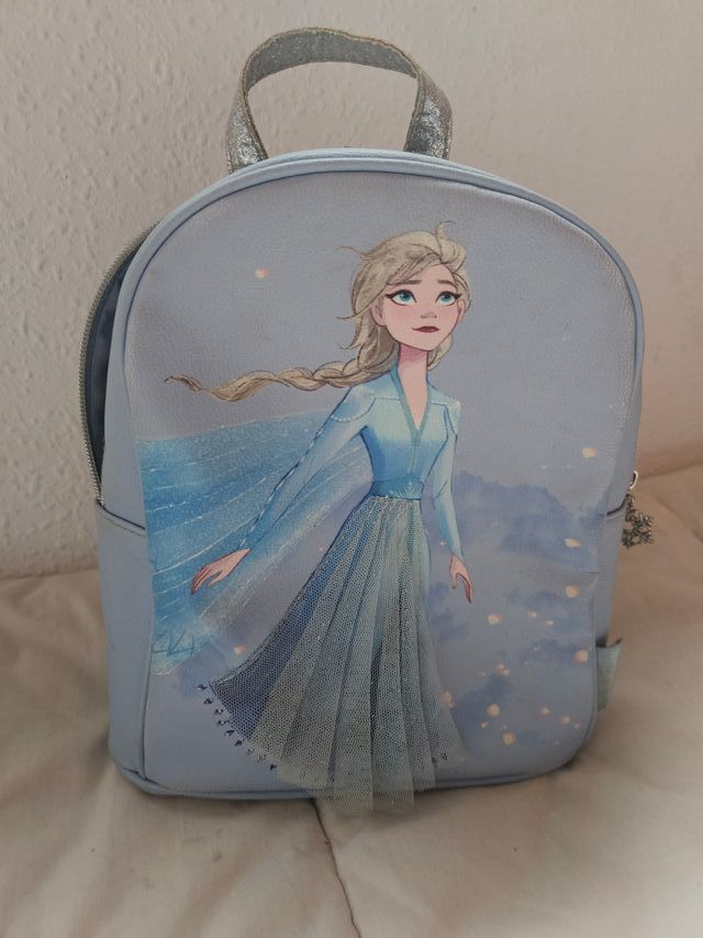 Mochila infantil con diseño de Elsa de Frozen. Ideal para los más pequeños. - Color azul claro. - Asa superior plateada. - Detalle de tul en la falda de Elsa.