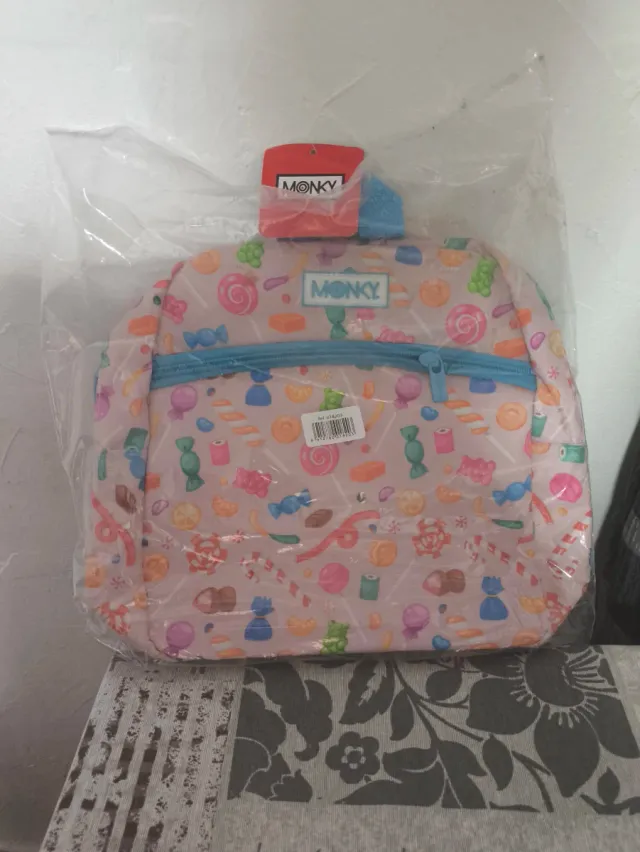 Mochila infantil con un divertido estampado de caramelos y golosinas. - Diseño colorido con dulces. - Cierre de cremallera. - Marca: Monky.