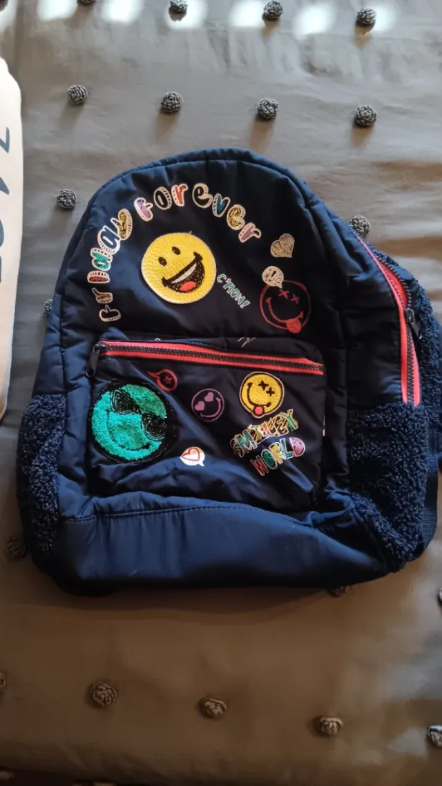Detalles del productoMochila azul marino con divertidos parches de caritas sonrientes y un mundo.