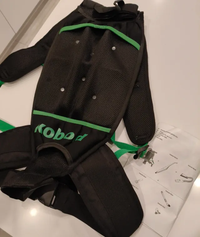 Mochila de transporte para aspiradora Kobold. - Color negro con detalles en verde. - Correas acolchadas para mayor comodidad. - Diseño ergonómico