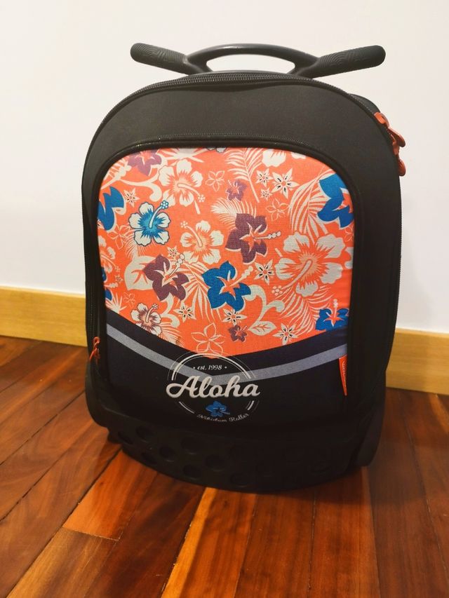 Mochila con ruedas Nikidom Roller XL modelo Aloha. En buen estado, con signos de uso. Incluye funda impermeable para la mochila de la misma marca con banda reflectante.