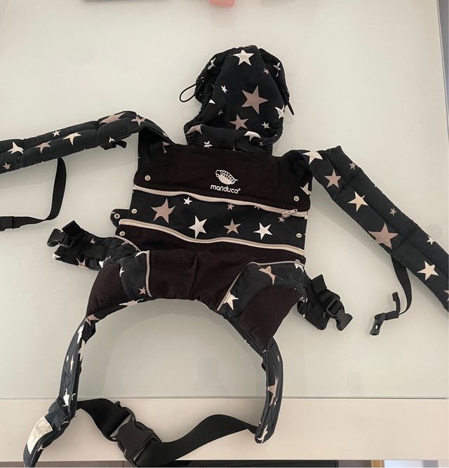 Detalles del productoMochila porta bebé Manduca con un divertido estampado de estrellas.