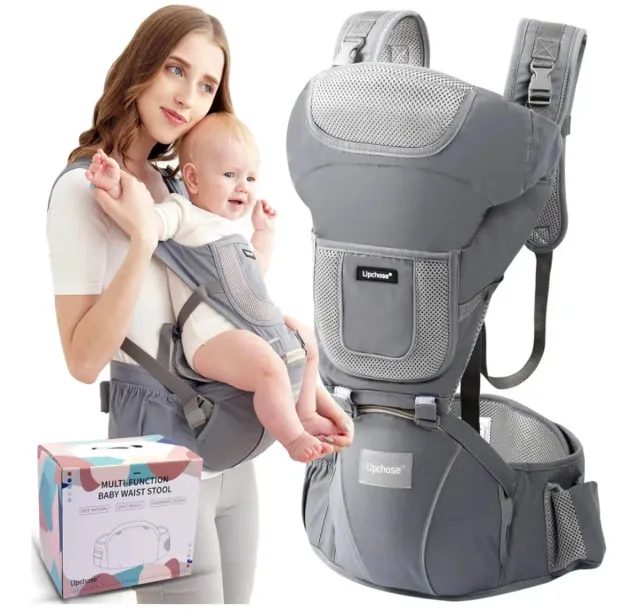 Detalles del productoMochila portabebés multifunción de la marca UPCHASE, ideal para bebés de 0 a 6 meses. Es de color gris y está fabricada con materiales de malla transpirable para mayor comodidad.
