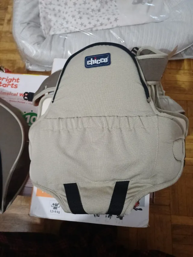 Mochila portabebés de la marca Chicco. - Color beige con detalles en azul marino. - Cierre de seguridad. - Apta para bebés de 3,5 a 9 kg.