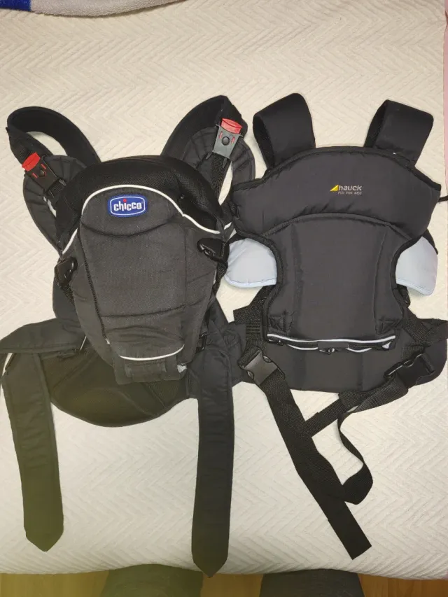 Detalles del productoDos mochilas portabebés en color negro, una de la marca Chicco y otra de la marca Hauck.