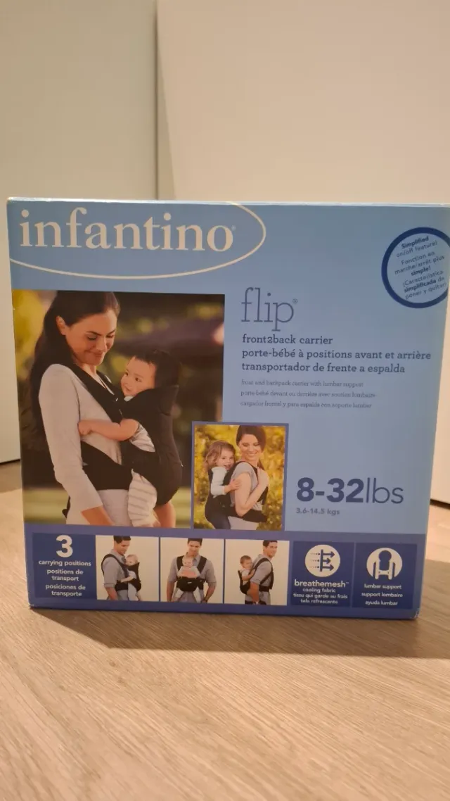 Detalles del productoMochila portabebés Infantino Flip, diseñada para llevar al bebé de frente o a la espalda. Soporta entre 8 y 32 libras (3.6-14.5 kgs).