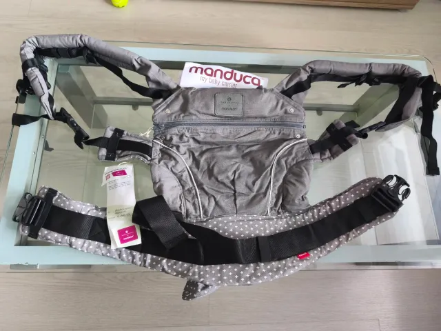 Detalles del productoMochila portabebés Manduca en color gris con un diseño de crucecitas blancas en la zona interior y lumbar. Es cómoda y ergonómica.